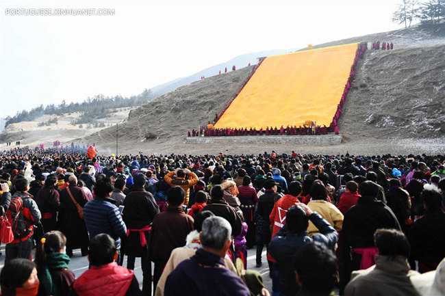A exibição anual de pinturas do Buda feitas no estilo thangka, um tipo de pintura originária do Tibete, é feita no monastério de Labrang e é a maneira tradicional do budismo tibetano para rezar por um bom ano. Uma cerimônia de “Buda ao sol” foi realizada na quinta-feira, 9 de fevereiro, pela manhã no Mosteiro Labrang, na Província de Gansu, noroeste da China.