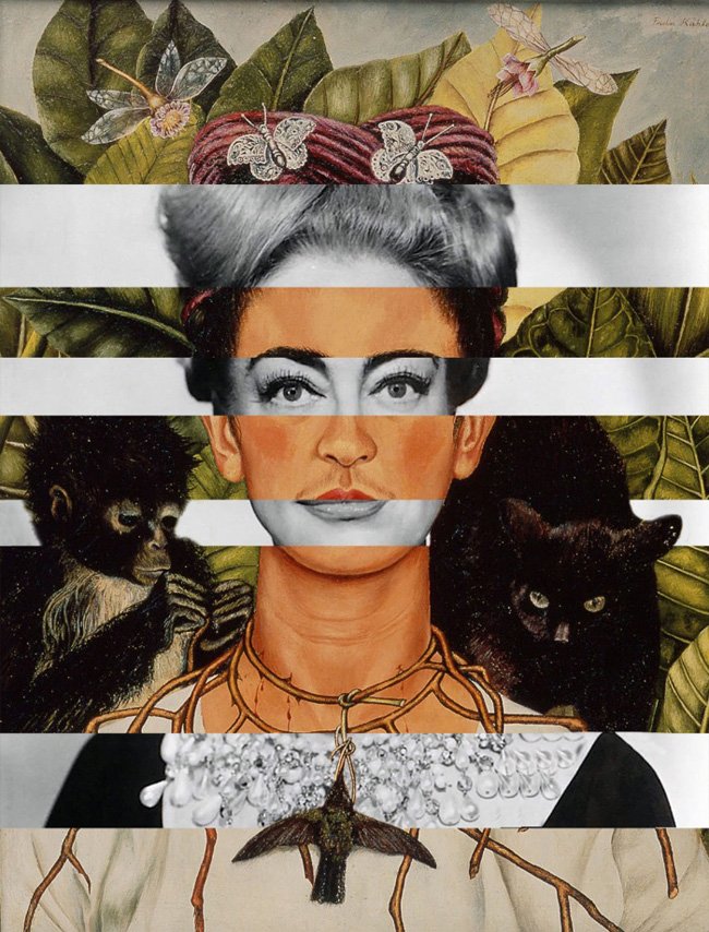 O Autorretrato com espinhos e beija-flor (1940), de Frida Kahlo, tem os olhos e a boca da atriz Joan Crawford, uma das grandes divas de Hollywood.