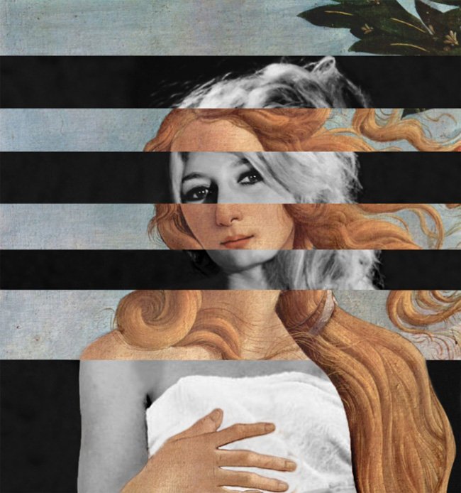 B.B., ou seja Brigitte Bardot, a Vênus francesa do cinema dos anos 1950, aqui se transforma na Vênus de Botticelli (O nascimento de Vênus, 1482-1485) obra conservada no Museu degli Uffizi de Florença, Itália.