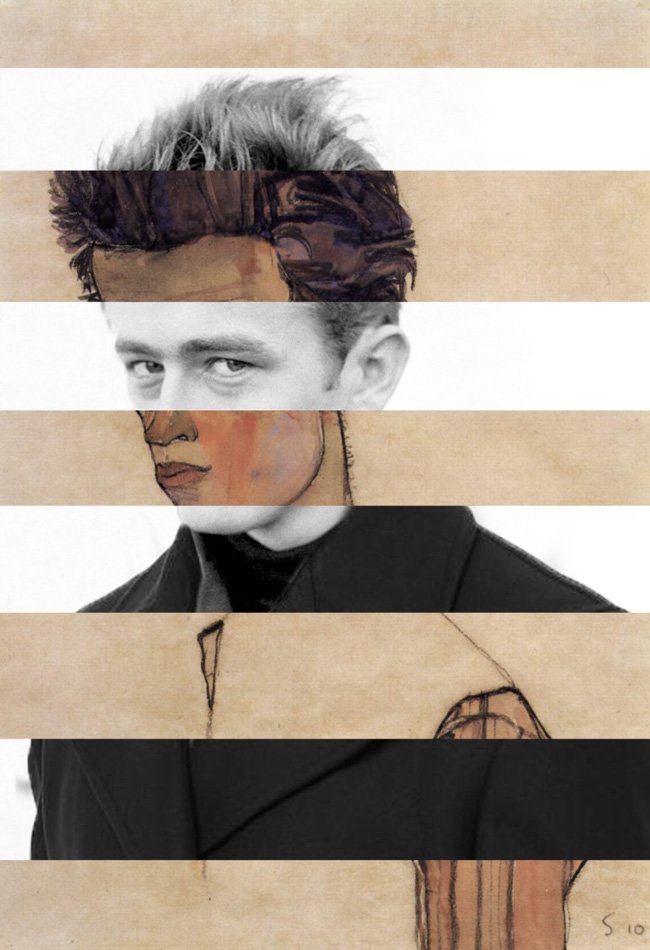 É James Dean, mas “por baixo” está o Autorretrato (1912) de Egon Schiele, o pintor expressionista austríacos morto aos 28 anos (em 1918), depois de uma vida difícil e atormentada. Exatamente como o protagonista de Juventude Transviada, o rebelde de Hollywood, morto com apenas 24 anos, em 1955.