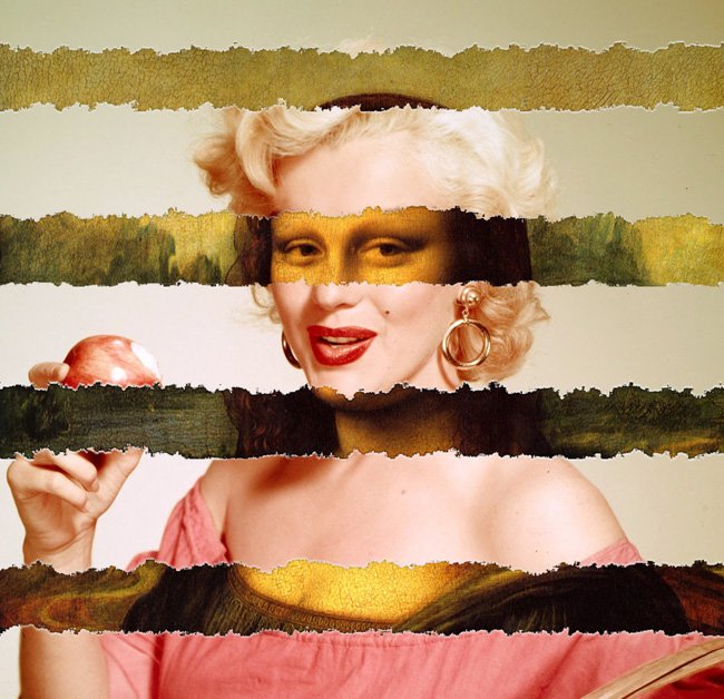 O nome dessa técnica, em inglês, é mashup: a arte de criar obras híbridas juntando de modo harmônico fragmentos de obras-primas da pintura e do desenho com pedaços de fotografias. Luigi Tarini, artista gráfico e fotógrafo de Cagliari, a capital da Sardenha, realizou uma série demashups surpreendentes sobrepondo mitos do cinema a obras-primas das artes plásticas. Por exemplo, Marilyn Monroe sobreposta à Mona Lisa de Leonardo.