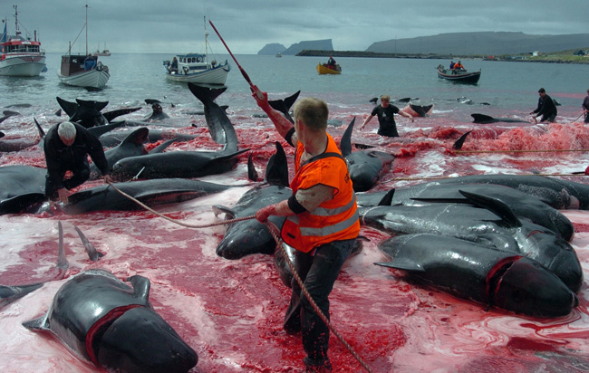 Nessas ilhas do Mar do Norte, ligadas à Dinamarca como província autônoma, a crueldade dos homens para com as baleias é ainda mais terrível: a matança é feita com as próprias mãos e com facas de cozinha!