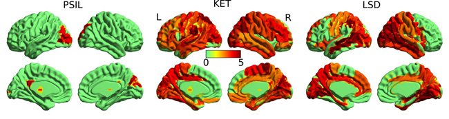 Da esquerda para a direita, a atividade do cérebro sob a ação da psilocibina, LSD e quetamina. As áreas em vermelho indicam a ocorrência de uma atividade neural mais caótica e casual com relação à norma.