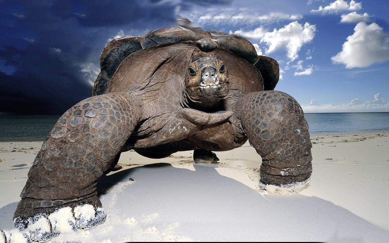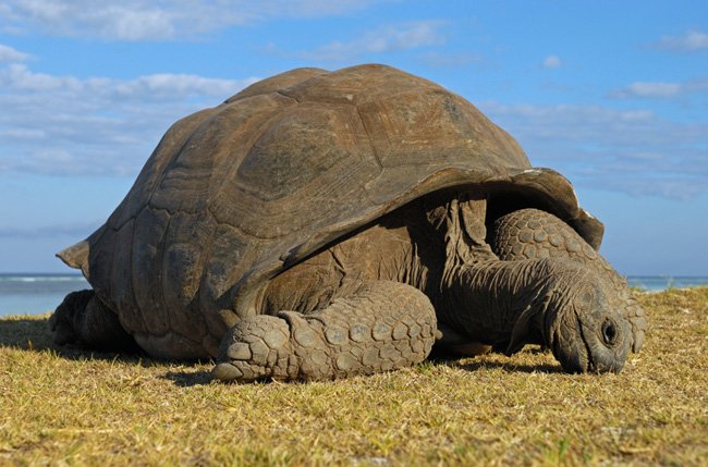4 Tartaruga gigante de Aldabra. O primeiro animal terrestre da lista é a tartaruga gigante de Aldabra (Aldabrachelys gigantea), originária do atol homônimo no arquipélago das Seychelles. Elas podem viver até os 152 anos e desovam a cada dois anos. Foto: Wil Meinderts.