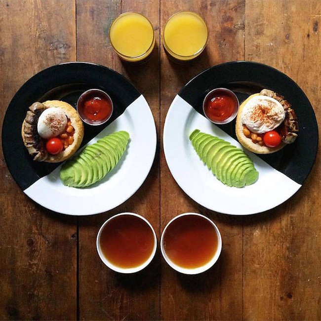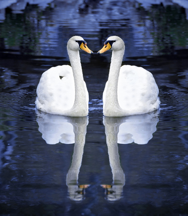 Eu peguei duas fotos aqui e as tornei artificialmente simétricas. E se eu perguntar a vocês qual acham mais bonita, vocês provavelmente escolherão as duas de baixo. Porque é difícil fazer simetria. E se você pode se fazer simétrico, está mandando um sinal que você tem bons genes, tem uma boa formação e portanto será um bom parceiro. Então simetria é uma linguagem que ajuda a comunicar informação genética.