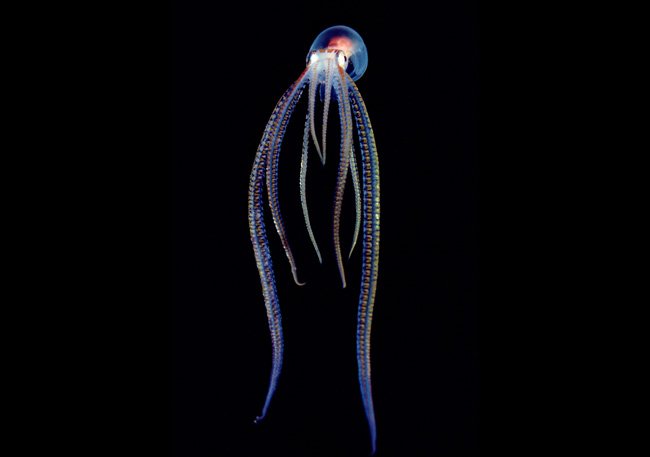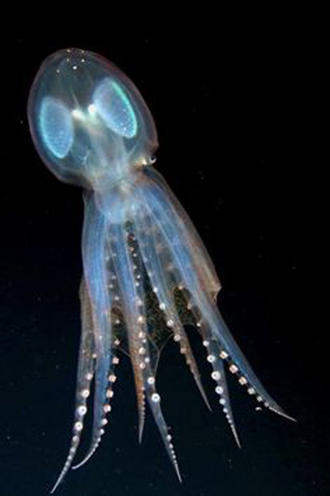 O calamar-de-vidro pertence à família dos Cranchiidae, a mesma do calamar-gigante. Vive nas águas de profundidade média de todos os mares do mundo, mas é praticamente invisível – graças ao seu manto natural de invisibilidade. Com comprimento entre 4 e 10 centímetros, como todos os calamares ele tem 8 “braços” e 2 tentáculos mais longos e mais robustos, adaptados para a caça. É também chamado de “calamar-escafandrista” porque regula a profundidade de flutuação enchendo e esvaziando de água uma cavidade que se encontra na parte anterior do manto.