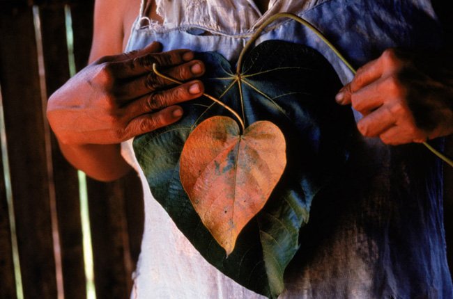 4 – Sobre o peito, a folha em forma de coração da “sangue de dragão” (Croton lechlerii), planta que tem esse nome por causa da sua resina de cor vermelho vivo. A farmacologia tradicional extrai dela uma substância útil para a cura de úlceras gástricas e também da herpes, enquanto os curandeiros peruanos usam o extrato dessas planta para o tratamento de cortes, bronquites e diarreias.