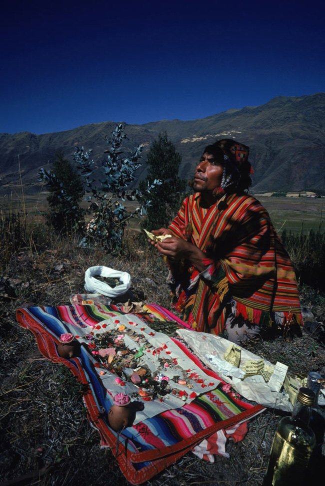 2 – O xamã peruano acredita no poder da prece propiciatória para favorecer uma generosa colheita de ervas. Nessa cultura, a folha da coca é o ingrediente essencial da maior parte das cerimônias de cura. A arte de conhecer as propriedades medicinais das plantas dos Andes é um patrimônio que se transmite de pai para filho. A colheita das plantas medicinais, com efeito, requer uma preparação adequada e um conhecimento específico.