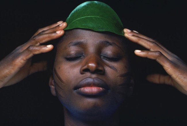 7 - Na Nigéria, uma mulher mantem apoiada sobre a testa uma folha da “planta da dor-de-cabeça”. Trata-se de uma erva usada principalmente para a cura desse distúrbio, mas que é usada também para tratar de feridas da pele e dores nas articulações.